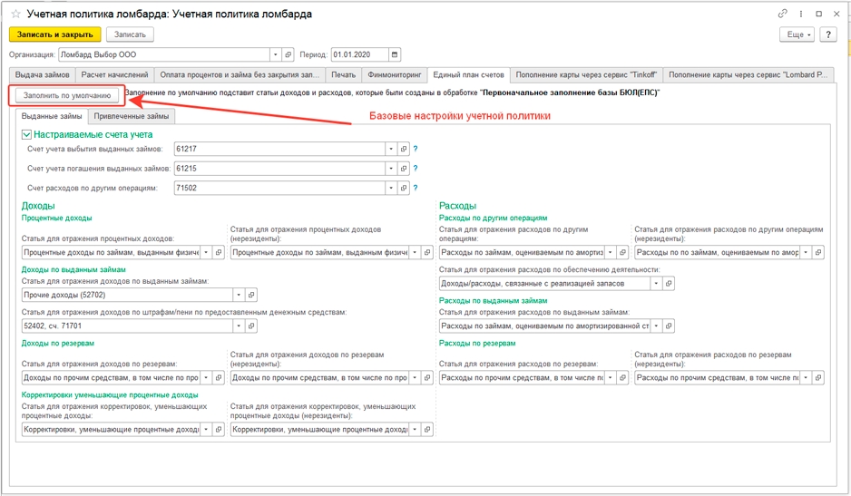 Для удобства работы и простоты освоения, в “БЮЛ ЕПС” предусмотрен сервис автоматического заполнения счетов учета и статей для отражения доходов и расходов. Заполнение происходит в соответствии с базовой учетной политикой.