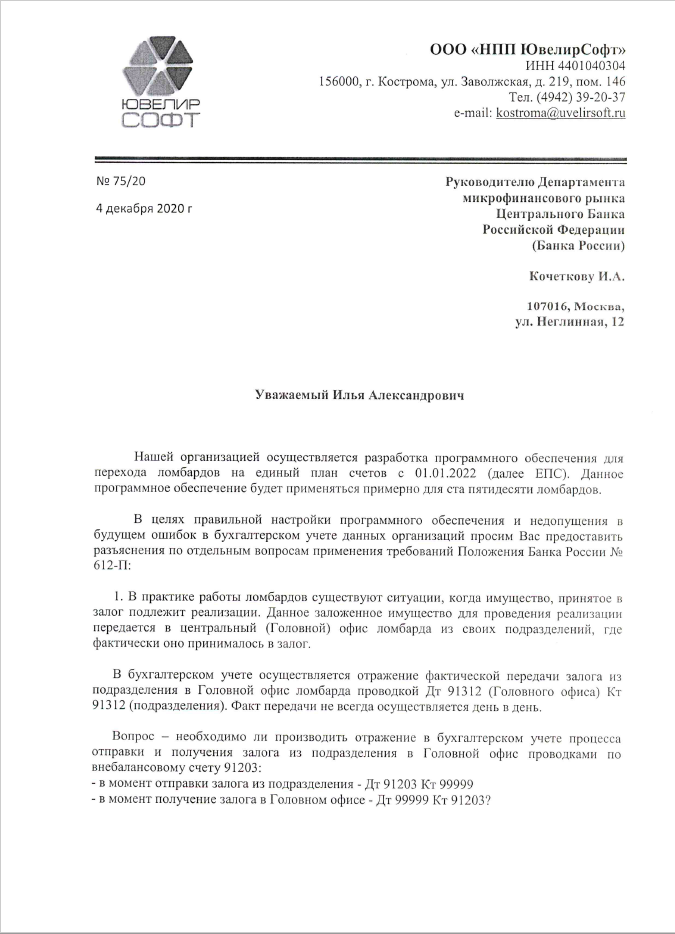Программный продукт “Бухгалтерия Ювелирного Ломбарда ЕПС” разработан в соответствии с положением №612-П от 25 октября 2017 г.